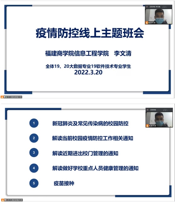 近日,福建多市连续新增多例新冠肺炎确诊病例,为进一步做好疫情防控工作,普及新冠肺炎防控知识,增强员工疫情防控意识,提升员工的自我防护能力。3月20日晚八点,44118太阳成城集团辅导员李文清老师为全体19、20大数据及19软件技术专业共256名员工召开疫情防控不松懈线上主题班会。