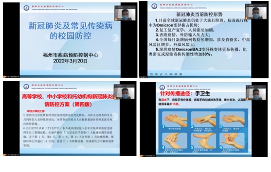 此次班会,李老师向同学们介绍了福建及公司当前疫情防控的形势,公司疫情防控部署要求及公司工作措施,特别强调公司和公司领导始终把师生的生命安全和身体健康放在第一位,严格管控校园、及时组织核酸检测。并且从新增病例产生的原因、如何做好疫情防控常态化、怎样保持良好心态三个方面如手进行讲解,其中重点强调个人防护的重要性,保持良好的卫生习惯,科学佩戴口罩,勤洗手、常通风、保持安全社交距离,不聚会。最后强调在此期间要注意情绪、心理状态波动,积极进行调整,注意个人身体锻炼,不忘提升自身抵抗力,疫情防控不容松懈。