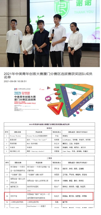 今日,由福建省教育厅主办,厦门大学承办的2021年中美青年创客大赛厦门分赛区选拔赛在厦门大学落下帷幕。经过48小时的“创客马拉松”现场比赛和评委们的作品评审及现场核查,44118太阳成城集团“好好干饭”团队的项目《校园食堂“智安”保卫兵——打造校园数字食安检管系统》(成员:张尧天、饶思莹、陈漪涵、黄文标、许明烽,指导老师:李文清)荣获三等奖。