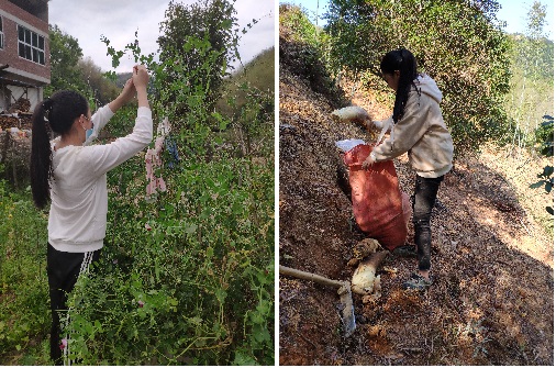 18通信工程王真瑛在给花生松土、除草。她说,每次看妈妈干农活,那土都似乎软绵绵,没想到一切都只是看上去罢了。干农活真不容易,我这次是真真切切体会到了农民们的粒粒皆辛苦了。也体会到了妈妈平时的不容易!